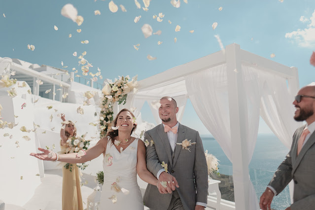 A lot of weddings have been postponed due to corona virus. Most of the couples in 2021 they decided to come back and have their destination wedding in Greece with less guest numbers. The Greek islands they experinced a different type of weddings, the microweddings. This Boho wedding in Greece took place in Santorini island, at Santa Irene chapel yard and then the we couple offered a nice and cozy wedding dinner at Laze beach bar. They tied the knot with a nice simple cereomony with blue and white ropes , the colors of Greece.